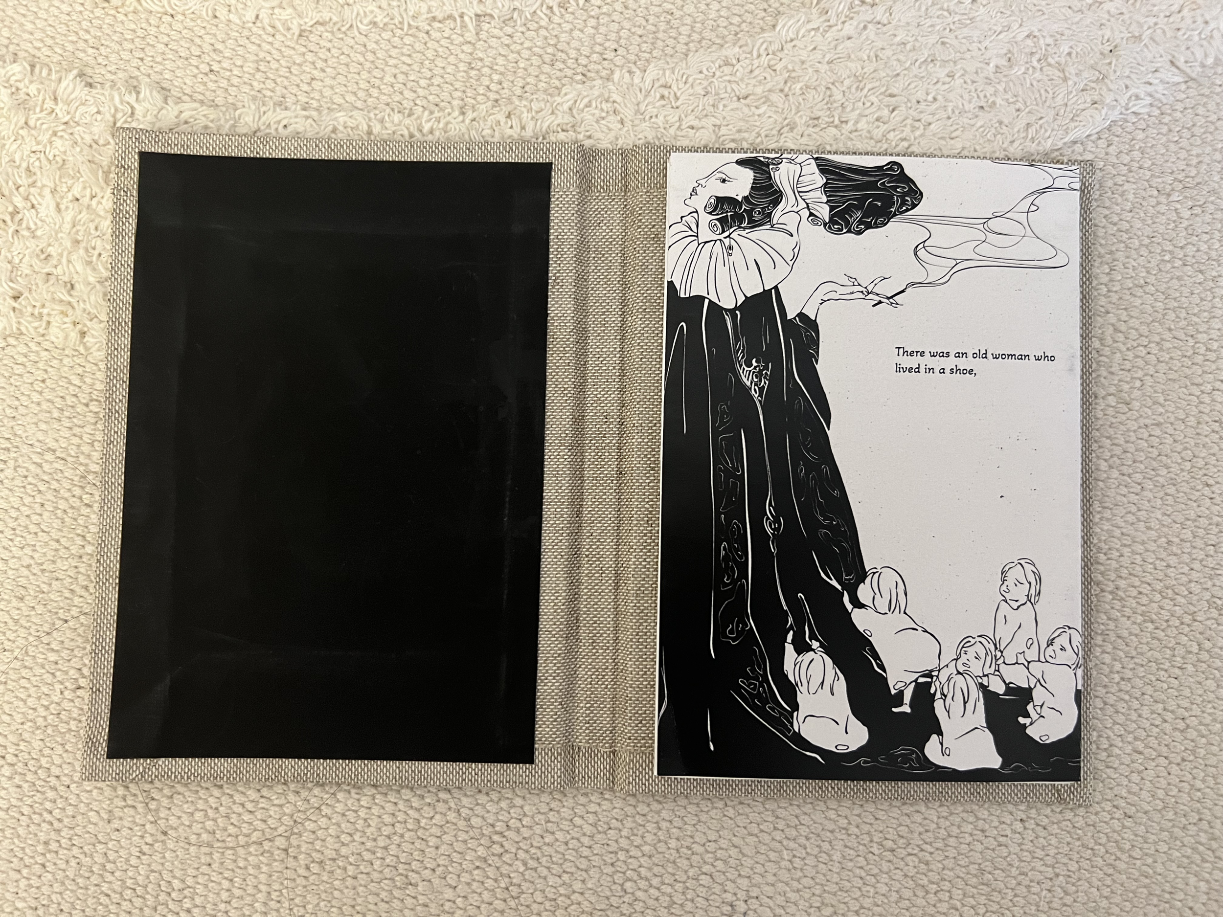 This seven-page folded zine is based on the British nursery rhyme There Was an Old Woman Who Lived in a Shoe. I reimagined the story with a restrained and distant tone, using repetition, negative space, and quiet tension to bring out the discomfort that lies beneath the rhyme’s playful surface. Instead of illustrating the text literally, I let the visuals carry a slow-burning sense of unease—like something slipping through the cracks of a children’s tale.
